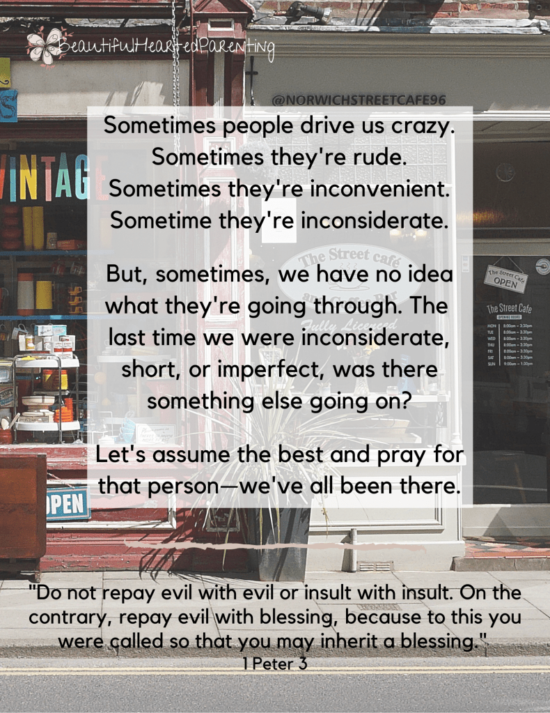 No, it doesn’t give people the right to act any way they want. But, it does make me want to pause and consider that we have no clue what that person is going through and to ask ourselves, Is it better to respond rudely, or to respond with blessing?
