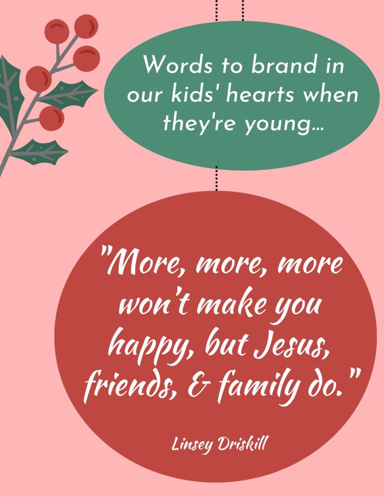 I started teaching this phrase to my triplets when they were very young. I wanted them to have in their hearts that more, more, more won’t make you content. I know that family and friends can disappoint us, but the premise of this saying is simply that material things won’t make us happy, but what will bring more contentment is relationship and things that last – time with family, time with friends, Jesus. There is a lot more fullness in life when we aren’t continually longing for the next thing. A great reminder this Christmas season.
