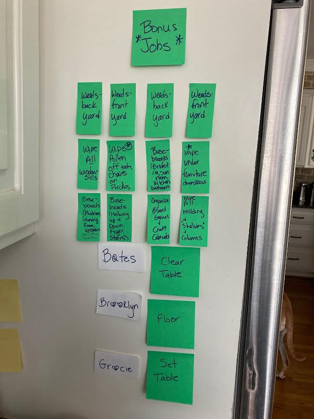 The kids get to pick one bonus job to do each week. If I need a job done that week, I put a star on it so jobs with stars have to be picked that week. If there are no starred jobs, they can do whichever one they want. Examples are pull weeds, wipe all windowsills, wipe baseboards, wipe under furniture, etc. - That week, whenever the kids want, they pick the bonus job they would prefer and put the post-it-note next to their name when they are about to begin it.